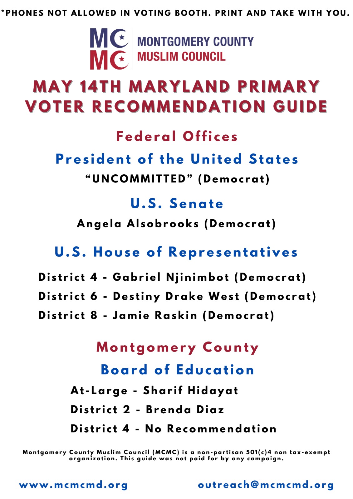 Montgomery County Muslim Council (MCMC) is a non-partisan organization, focusing its voter recommendations on the values and interests of our community. This process is influenced by the political landscape of Maryland and Maryland election law, which allows Primary voters to only vote for candidates within their registered party. As such, MCMC’s recommendation is to register as a Democrat and vote for the candidates identified.